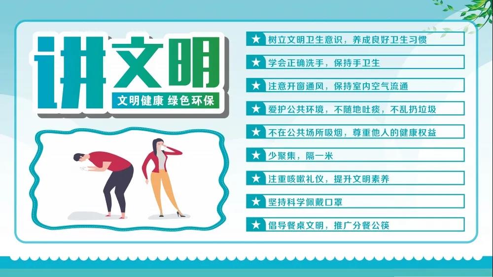 树立文明卫生意识,养成良好卫生习惯。学会“七步洗手法”,养成正确洗手习惯,保持手部卫生。注意开窗通风,保持室内空气流通。爱护公共环境卫生,不随地吐痰不乱扔垃圾,不在公共场所吸烟,尊重他人健康权益。“少聚集、隔一米”。注意咳嗽礼仪,倡导文明素养。坚持科学佩戴口罩。