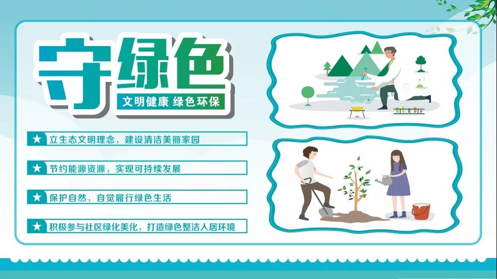 树立生态文明理念,建设清洁美丽家园。节约能源资源,实现可持续发展。积极参与社区绿化美化,打造绿色整洁人居环境。