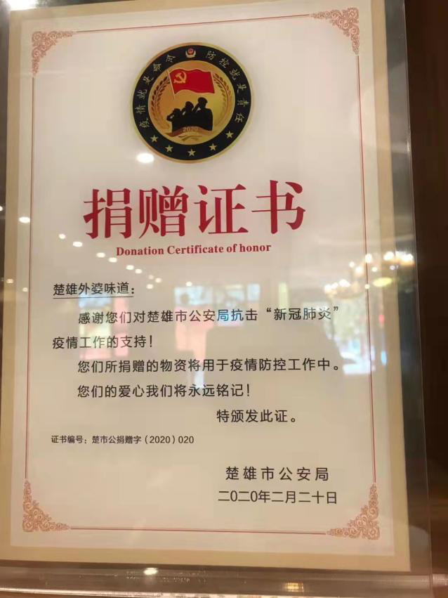 致富思源,乐于奉献。在经营中大力发场“致富思源,富而思进,扶危济困,共同富裕,义利兼顾,德行并重,回馈社会”的精神,在效益增加的同时,没有忘记那些在疫情来临时为老百姓默默奉献的公安、交警、医务人员,为他们免费送去5000多份爱心营养餐。外卖平台上启动每单送1元的爱心基金以实际行动回馈社会。组织两店员工爱心献血支援前线。坚持照单纳税,在免税的同时向国家上缴个人税费2万余元,做到富了不忘国家,富了不忘人民,富了不忘回报社会。
