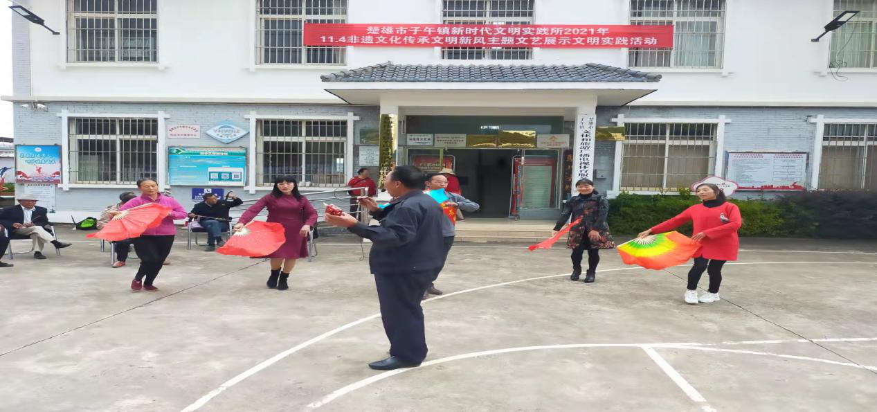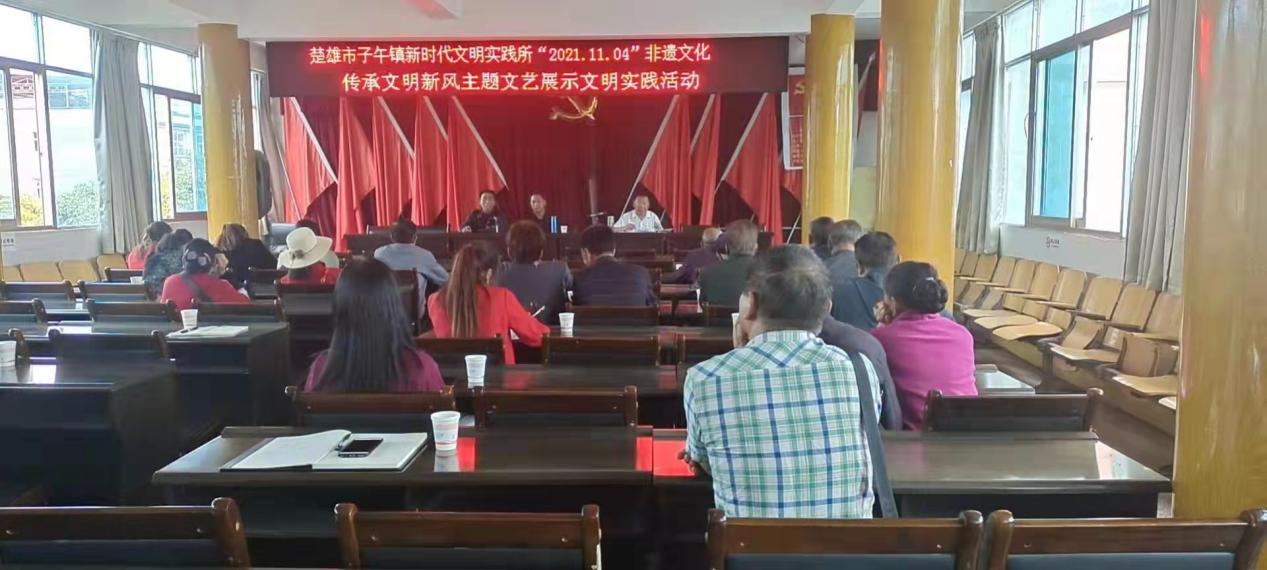 2021年11月4日下午,子午镇文旅服务中心组织镇辖13个村文化辅导员、25位非遗文化项目代表性传承人及站所文化热心人士、各村文艺队队长共60人在镇文旅中心开展2021年度非物质文化遗产代表性传承人述职考核工作及2021年非物质文化遗产代表性传承人非遗文化传承文明新风实践才艺展示活动,子午镇部分群众参与展示活动。