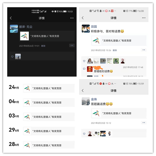 此次竞赛活动的题目每次10题,内容涉及了文明交通、文明旅游、文明餐桌、社交礼仪等文明礼仪,题目生动有趣,充分调动了广大市民和干部职工参与的积极性。经过一个月的答题活动,共决出一等奖2名,二等奖8名,三等奖24名,幸运奖76名,分别以话费的形式存入获奖人员的手机号。