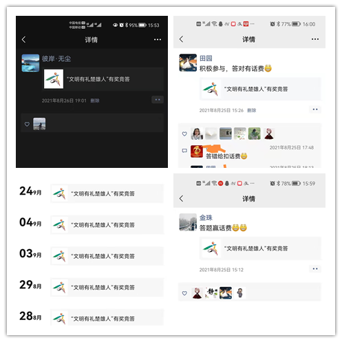 此次竞赛活动的题目每次10题,内容涉及了文明交通、文明旅游、文明餐桌、社交礼仪等文明礼仪,题目生动有趣,充分调动了广大市民和干部职工参与的积极性。经过一个月的答题活动,共决出一等奖2名,二等奖8名,三等奖24名,幸运奖76名,分别以话费的形式存入获奖人员的手机号。