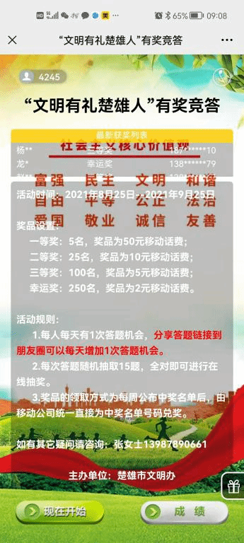 楚雄市为进一步学习贯彻《新时代公民道德建设纲要》,提升公民行为道德素养,让群众积极参与精神文明建设工作,发现感受身边的好人好事和文明行为,努力营造“共建文明城市,同享文明生活”良好氛围,在全市干部群众中举办为期一个月的“文明有礼楚雄人”网上知识竞赛活动。识竞答活动采取线上方式,进入“文明威楚”公众号的底部菜单栏链接,每人每天可参加一次答题,分享答题链接可以增加一次答题机会。