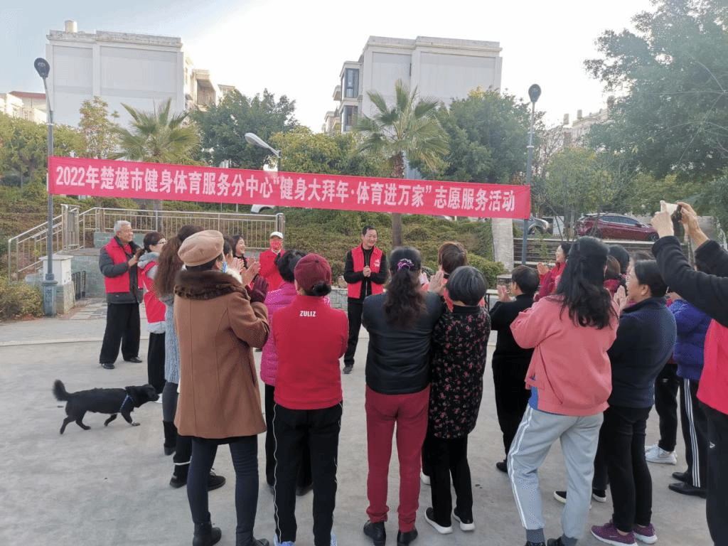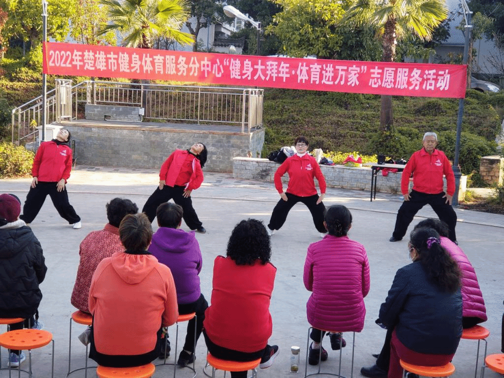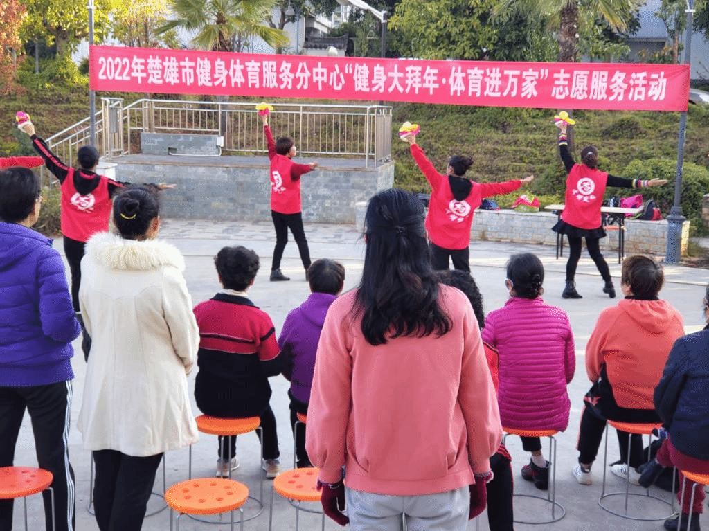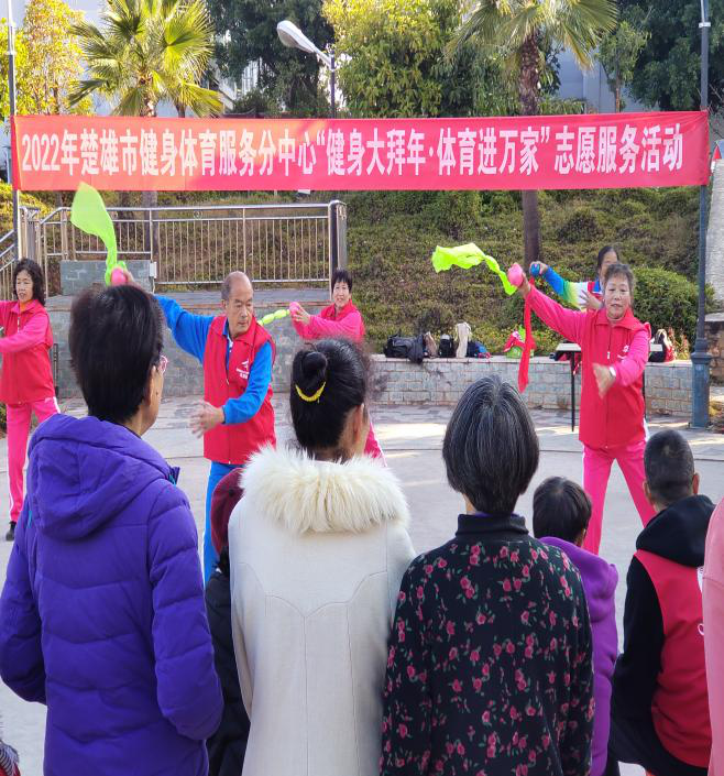 2022年1月14日早上楚雄市老体协携太极拳剑分会、柔力球分会、健身操分会到楚风苑小区开展志愿服务活动。