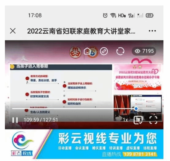 本次活动在楚雄市北城小学、北浦中学各举办了一场讲座。讲座采取线上线下的方式进行,两场讲座线下98名家长现场参与、线上6396名家长通过直播平台进行收看学习。