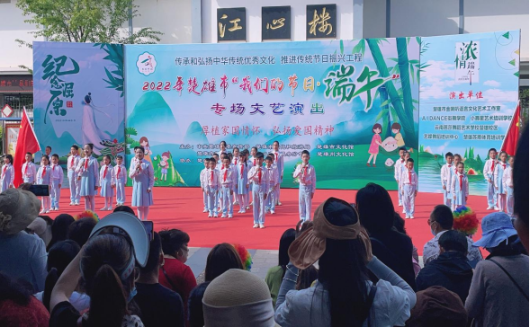 上午九点,随着优美的旋律响起,端午节专场文艺演出正式开始,整场演出以“厚植家国情怀 弘扬爱国精神”为主题,邀请了楚雄城区6个少儿培训机构参与演出,整场演出持续了近一个小时,并进行了网络直播,直播点击率近5万人,实现了线上线下同步进行。