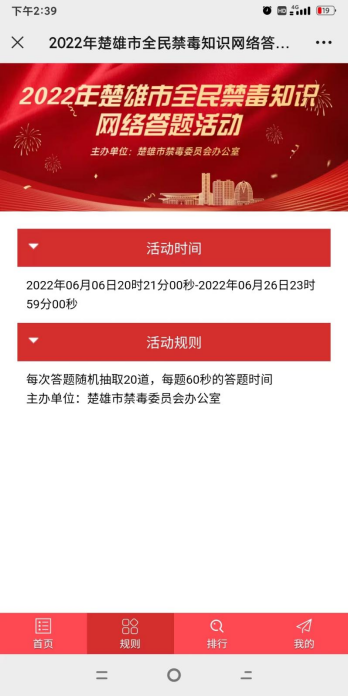 一、活动主题:2022年楚雄市首届全民禁毒知识网络答题活动。