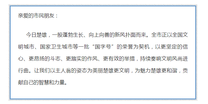 “城市因文明而美丽,市民因城市而自豪。”通过创文三载2020年楚雄市被授予第六届全国文明城市称号。荣誉背后是全市上下积极行动、不懈努力的成果,是文明之风吹遍楚雄大地的结果。“全国文明城市金字招牌”让楚雄市又多了一张靓丽名片,也让楚雄市开启了持续追求城市环境与精神文明双提升、丰富文明城市内涵的铿锵历程。为把楚雄建设得更加文明、更加美好,在此,楚雄城管向广大市民朋友们发出倡议: