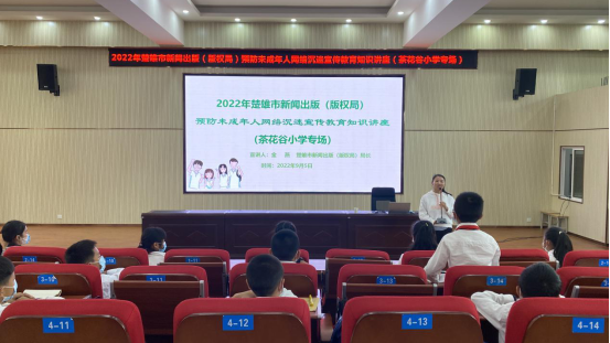2022年9月5日,楚雄市新闻出版(版权局)到楚雄市茶花谷小学开展预防未成年人网络沉迷宣传教育知识讲座。讲座中,主讲人与同学们互动交流,同学们积极发言。通过知识讲座,使未成年学生了解网络沉迷带来的危害、积极预防网络沉迷。