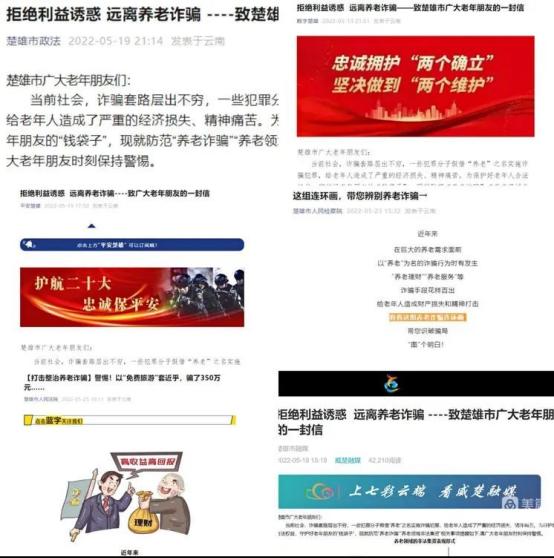 用好新闻媒体,加强正面宣传。协调各媒体所属网站、新媒体平台在显著位置开设专题专栏,及时集纳各媒体重点报道和新媒体稿件,做好重点报道推送传播,积极参与讨论和转发相关话题,营造有利于打击整治养老诈骗工作的良好舆论氛围,实现宣传有声有色、群众支持认可的良好效果。目前,开展涉养老诈骗网上宣传会议报道2次,典型案例宣传4条次,各新媒体账号发布信息数22条次,对现场活动报道宣传4条次,制作涉防养老诈骗宣传产品31条次。