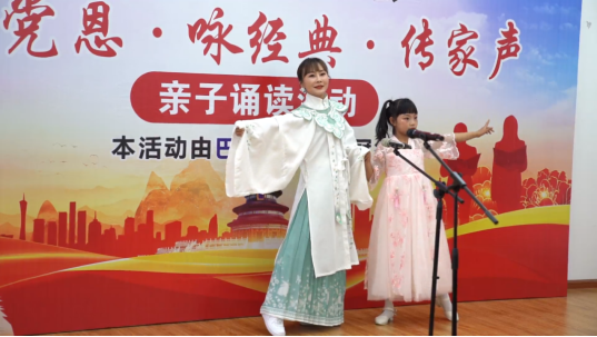 比赛现场,参加活动的12组家庭依次上场朗诵了《我爱你中国》、《感谢有你》、《幼学琼林》、《给未来一片绿色》等诗词散文,活跃的现场气氛,或激情高昂、或温婉抒情、或含情脉脉......通过孩子和家长的深情朗读,表达了对祖国对家乡的热爱之情和浓浓的家庭亲情。