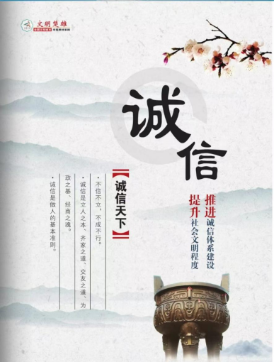 诚信是公民道德的基石,既是做人做事的道德底线,也是社会运的基本条件。我们倡导的诚信,就是要以诚待人、以信取人,说实话、办实事、做老实人。激发真诚的人格力量,以个人的遵信守诺,构建言行一致、诚信有序的社会;激活宝贵的无形资产,以良好的信用关系,营造“守信光荣、失信可耻”的风尚,增强社会的凝聚力和向心力。