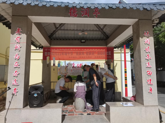 凉亭里的不断有居民们走进来写着自家的家风家训,把写好的家风家训卡风拴在红线上,大家相互看着红线上的写好的家风家训,谈论着家里的生活琐碎,渡过了一个愉快而又有意义的端午。临近傍晚,志愿者们刚想把大家挂上的家风家训拆下来,小区的居民们走上前,请求志愿者们让这些家风家训多挂几天,他们要让上学的孩子回来看一看,学一学这些家风家训。