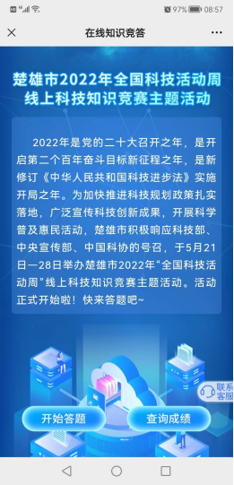 2022年是党的二十大召开之年,是开启第二个百年奋斗目标新征程之年,是新修订《中华人民共和国科学技术进步法》实施开局之年。为积极参与以“走进科技你我同行”为主题的2022年全国科技活动周,广泛宣传《中华人民共和国科学技术进步法》《中华人民共和国科学技术普及法》等法规及相关政策,扩大科技知识传播范围,楚雄市面向公众推出“全国科技活动周”线上科技知识竞赛主题活动。