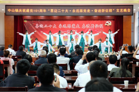 为庆祝中国共产党成立101周年,进一步激发全镇干部职工的爱党、爱国热情,中山镇文明实践所举行“喜迎二十大·永远跟党走·奋进新征程”主题文艺晚会,向党的101岁生日献礼。晚会以合唱、独唱、舞蹈、朗诵、演讲、乐器表演等形式多样,内容丰富,演员们精心准备,着装整齐,以饱满的热情、嘹亮的歌声演唱一首首经典红歌。活动现场歌声嘹亮,激情飞扬,精彩纷呈。