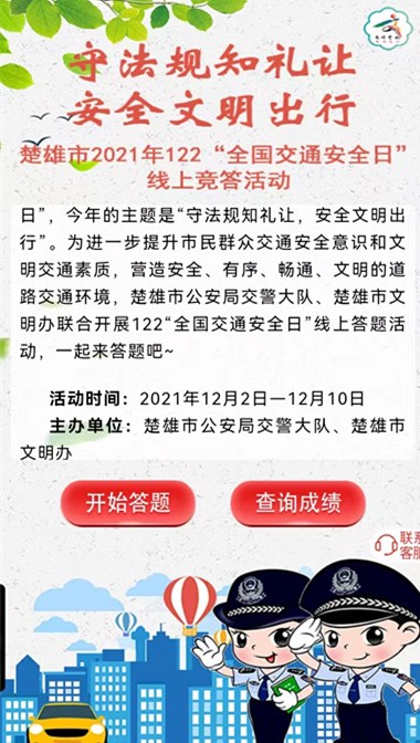 2021年12月2日是第十个“全国交通安全日”,今年的主题是“守法规知礼让,安全文明出行”。为进一步提升市民群众交通安全意识和文明交通素质,营造安全、有序、畅通、文明的道路交通环境,楚雄市文明办、市交警大队联合开展122“全国交通安全日”线上知识答题活动,期待您的参与。