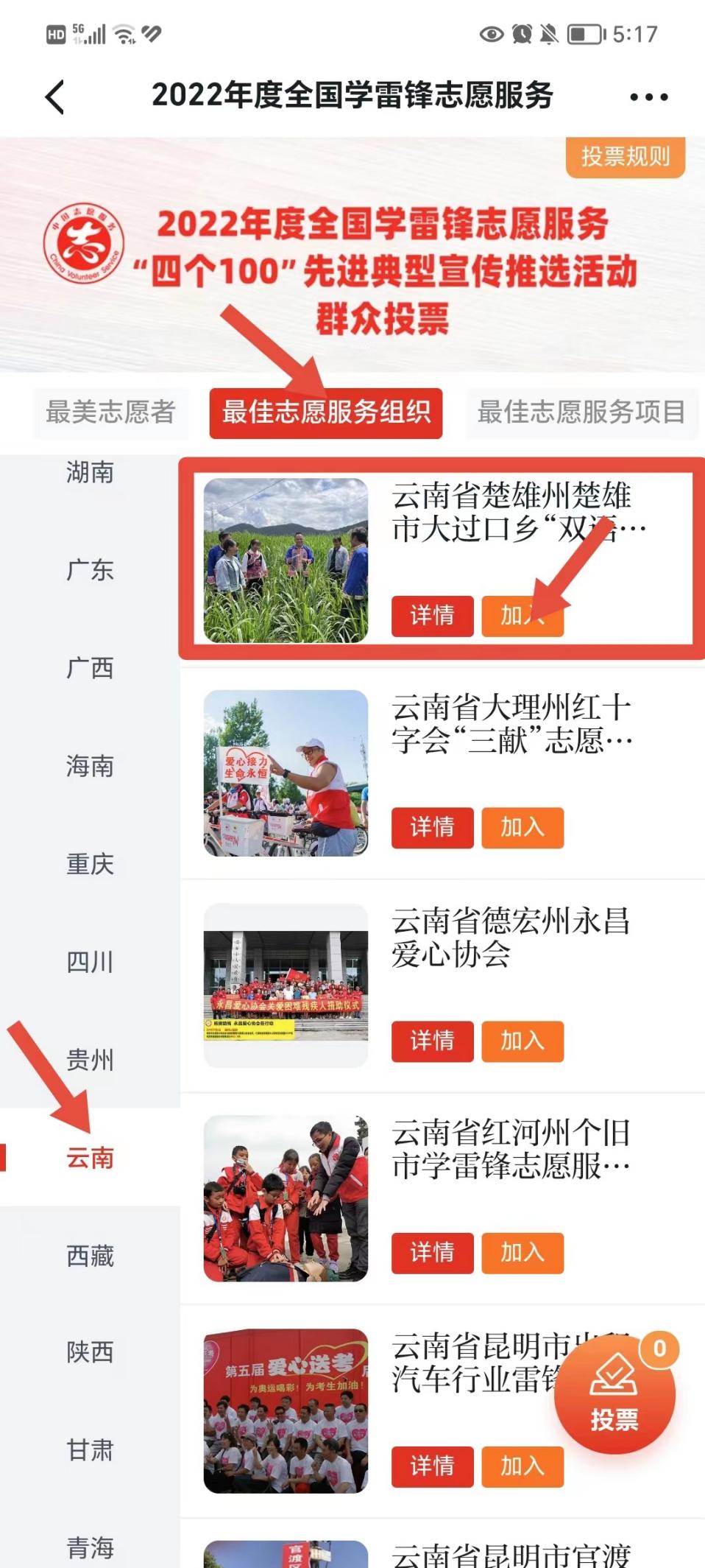 第一步:找到【最佳志愿服务组织】-【云南】-【云南省楚雄州楚雄市大过口乡“双语”宣讲志愿服务队】,点击“加入”,并在“最美志愿者、最佳志愿服务项目、最佳志愿服务社区”等其他类别中选满10票后,方可进行投票。