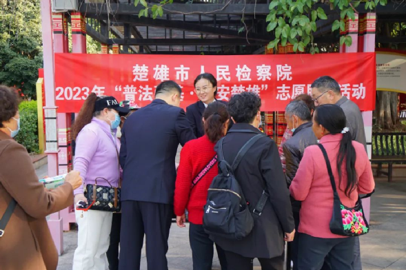 楚雄市检察院到桃源湖体育公园开展“普法强基·平安楚雄”法治宣传志愿服务活动,为在公园休闲健身的市民朋友们送上一堂普法课,将法律服务的触角延伸到群众身边,努力提高群众的法律意识。活动中,检察干警们向过往群众发放预防养老诈骗指南、打击网络电信诈骗等宣传册,并主动和群众唠家常、谈谈心,了解群众法治需求,就日常生活中可能触及的法律知识盲区进行讲解分析,教育引导群众如何识别非法集资、养老诈骗和新型电信网络诈骗等行为,教授群众在自身权益遭受侵害时运用法律武器来保护合法权益。活动期间共发放宣传资料1400余份,接受群众咨询50余人次,现场解答法律问题30余个。