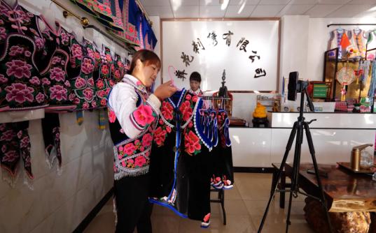 说起彝花刺绣有限公司发展历程,何开美很是感慨。“当时在外面打工就顾不了家里,带着外出务工多年的积蓄和对彝绣文化的热爱,我回到了家乡。在当地党委、政府的支持鼓励下,我大胆的迈出了发展彝绣的第一步,在我们乡镇上注册成立了彝花刺绣有限公司。通过几年的发展,今年又在楚雄市成立了一家分公司”。如今线上+线下的销售模式让何开美的公司年均收入超过百万,这是十多年前刚回到家乡创业的她从未想象过的。像何开美一样的彝绣产业致富能手只是众多绣娘的一员,她们凭借自己精湛的手艺、踏实肯干的精神,在家唱着歌、绣着花、带着娃、养好家。