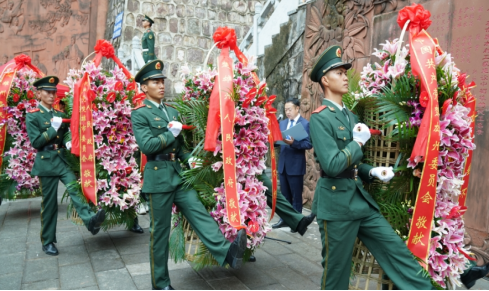在深情的《献花曲》中,礼兵护卫着楚雄市委市政府,各民主党派、各族群众、中国少年先锋队、烈士遗属、英模、劳模代表敬献的花篮,缓步走向英烈墙,敬献花篮。