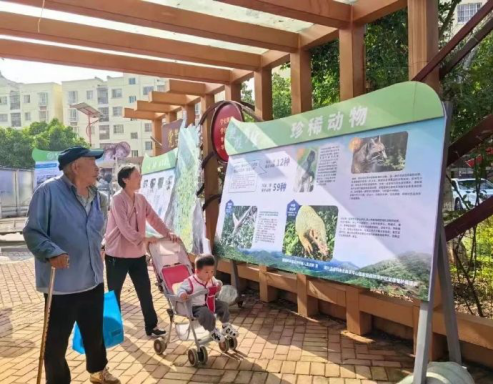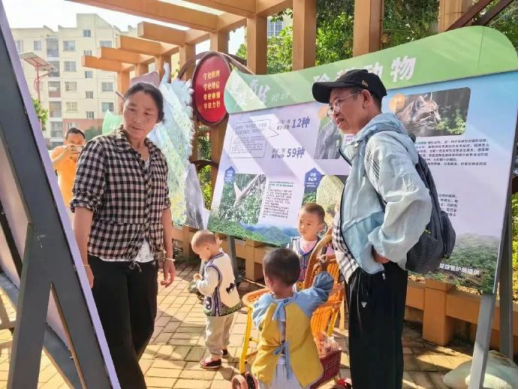 2023年8月14日上午,楚雄市栗子园社区内,社区群众驻足围观生态环境司法保护宣传展板,相互讨论并拿出手机与展板上的绿孔雀合影。