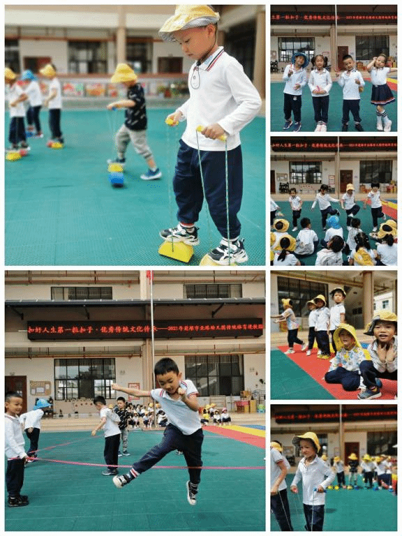 尤其是一些传统体育游戏,不仅符合孩子们的好学、好动、好模仿、好游戏的心理特点,又不受时间、空间、地点、材料、人数的限制,我园将传统体育游戏渗透于幼儿一日在园活动中,在早操中编排了适合孩子的武术操,在户外活动中组织开展跳皮筋、丢沙包、踩高跷、踢毽子等传统体育游戏,不仅给幼儿带来了健康的体魄与快乐,也完善了我园体育游戏的课程!
