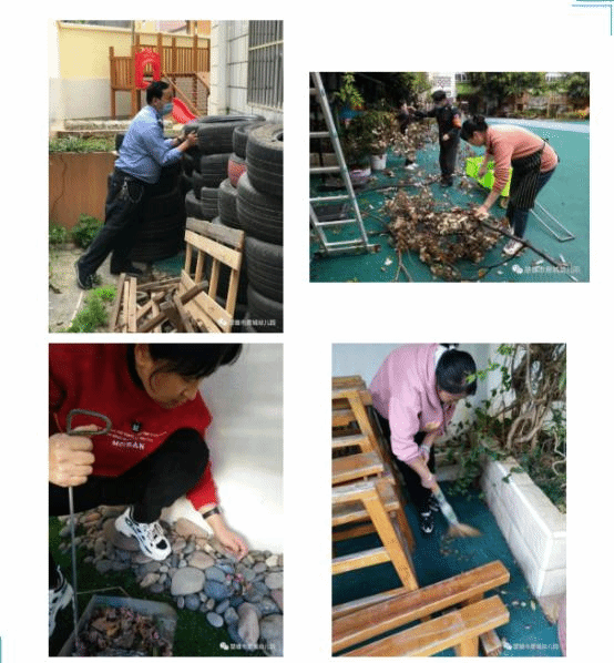 保育老师们对幼儿园的环境进行全面清扫,操场、草坪、房前屋后、楼顶、厕所等处的卫生死角进行彻底的清洗,清除垃圾、疏通水沟,消除蚊蝇滋生条件,做到无卫生死角,创建一个整洁有序的环境,用爱心和责任心,扮靓了两个园区。