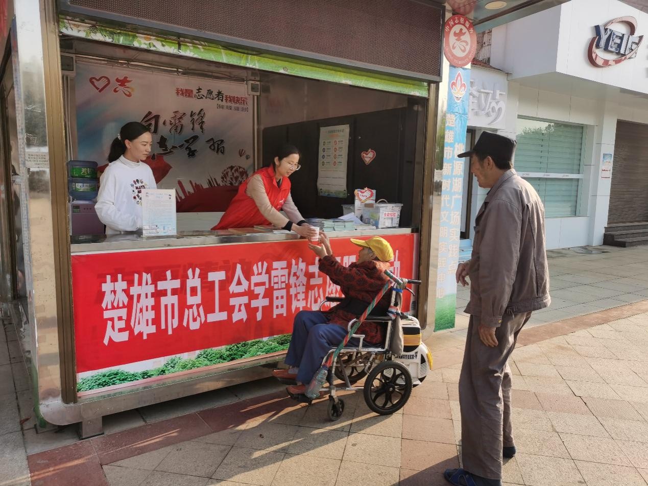 “学雷锋志愿服务岗亭为民服务活动”。在广场上,学雷锋志愿服务岗里,文明单位的志愿者正在为问路的行人耐心的解答,一杯热水、一把雨伞、一个充电宝、一个微笑......这些已经成为楚雄市的广场上常态化为群众服务的缩影。