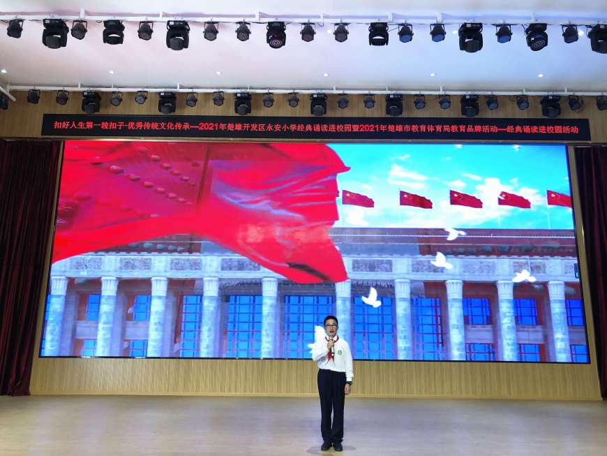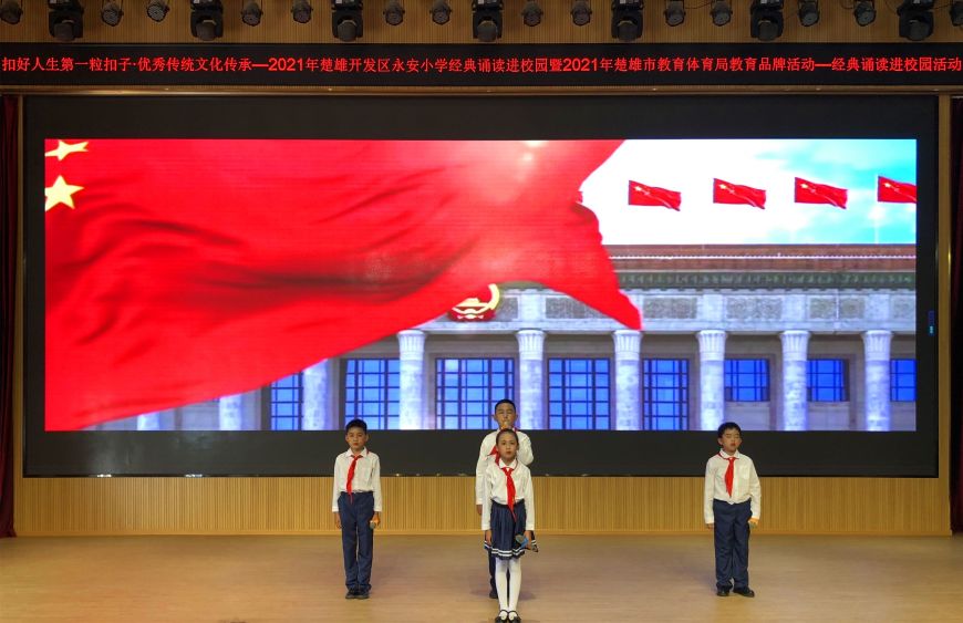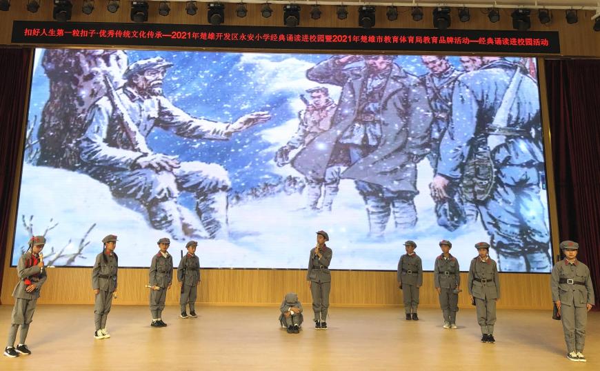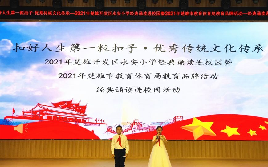 为全面贯彻“以立德树人为根本,社会主义核心价值观为引领,传承优秀传统文化为宗旨,加强未成年人思想道德建设,全面提升学生综合素质”的总任务,2021年9月6日下午,在楚雄市教育体育局的协调指导下,楚雄开发区永安小学在润贤厅开展了“扣好人生第一粒扣子·优秀传统文化传承”经典诵读进校园活动。整场活动会场气氛热烈,节目异彩纷呈: