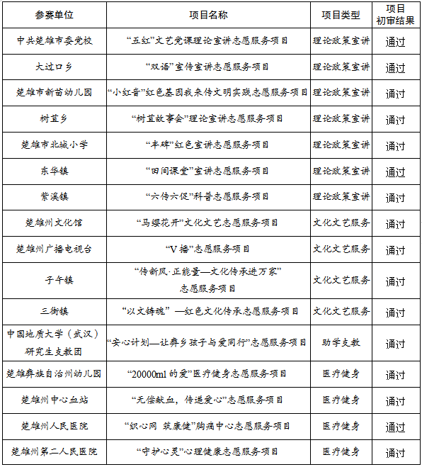 附件:楚雄市第二届“威楚志愿汇”新时代文明实践志愿服务项目大赛通过初审名单