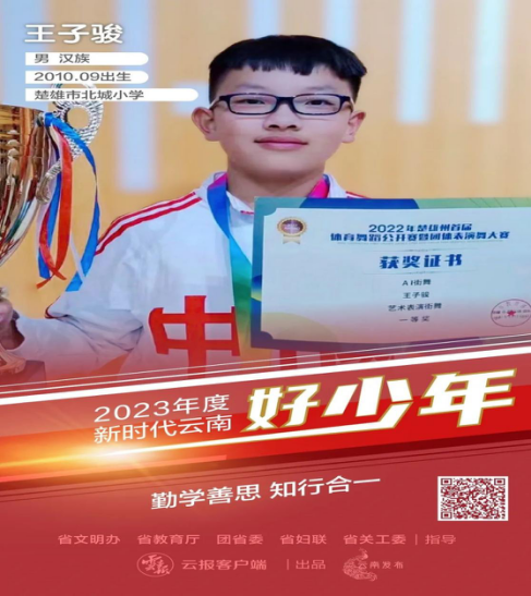 少年自有凌云志,通文达艺展风采。在王子骏身上,体现了全面发展和个性发展的辩证统一。学习中,他是不知疲倦的求索者,成绩始终名列前茅,多次被评为“优秀少先队员”“优秀学习之星”,高质量完成学习任务的同时,他积极发展自身特长,绘画、书法,多次获得省级金奖,州级、校级一等奖;他学习架子鼓和街舞,获得中国舞蹈家协会七级证书,曾获“星光校园才艺大赛”省级银奖,“云南省少儿频道才艺”优秀奖、团体冠军奖、楚雄州体育舞蹈公开赛一等奖;他学习研究编程,多次被评为一等奖;英语也是他的强项,发音、口语都很棒,经常被老师作为示范教学。王子骏说:“我们是新时代的中国少年,是祖国的希望、民族的未来,心向党、志为国。刻苦学习、坚定信念、磨炼意志、强健体魄,为实现中华民族伟大复兴的中国梦时刻准备着……”
