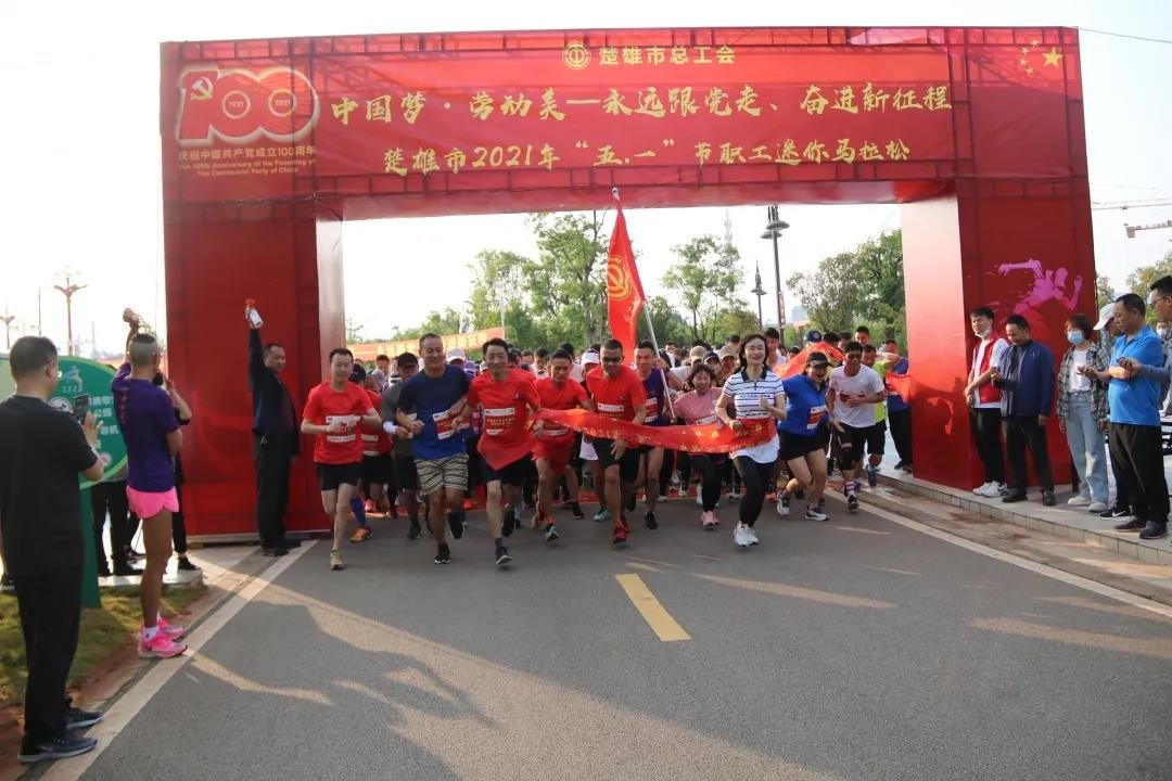 为庆祝建党100周年、纪念“五•一”国际劳动节,4月30日上午,主题为“中国梦•劳动美——永远跟党走,奋进新征程”楚雄市2021年“五•一”节职工迷你马拉松比赛在彝海公园正式开赛。此次比赛由楚雄市总工会主办,楚雄市教育体育局工会、楚雄市卫生健康局工会、楚雄市城市管理综合行政执法局工会、楚雄市交警大队工会、楚雄市文化馆协办。全市113家机关企事业单位,近700名职工参赛。比赛以单位团体组队形式参加,3人为一队,线路以彝海公园蓝色沙滩广场为起终点,环绕彝海公园杨家山和月琴山一圈共7.01公里。