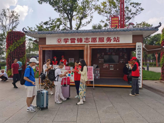 在楚雄高铁站,学雷锋志愿服务站的志愿者一边帮助游客提运行李,一边为游客提供交通引导、景区景点介绍及国庆期间文旅活动推荐服务,让游客一到楚雄就能感受到火火楚雄的热情和文明。