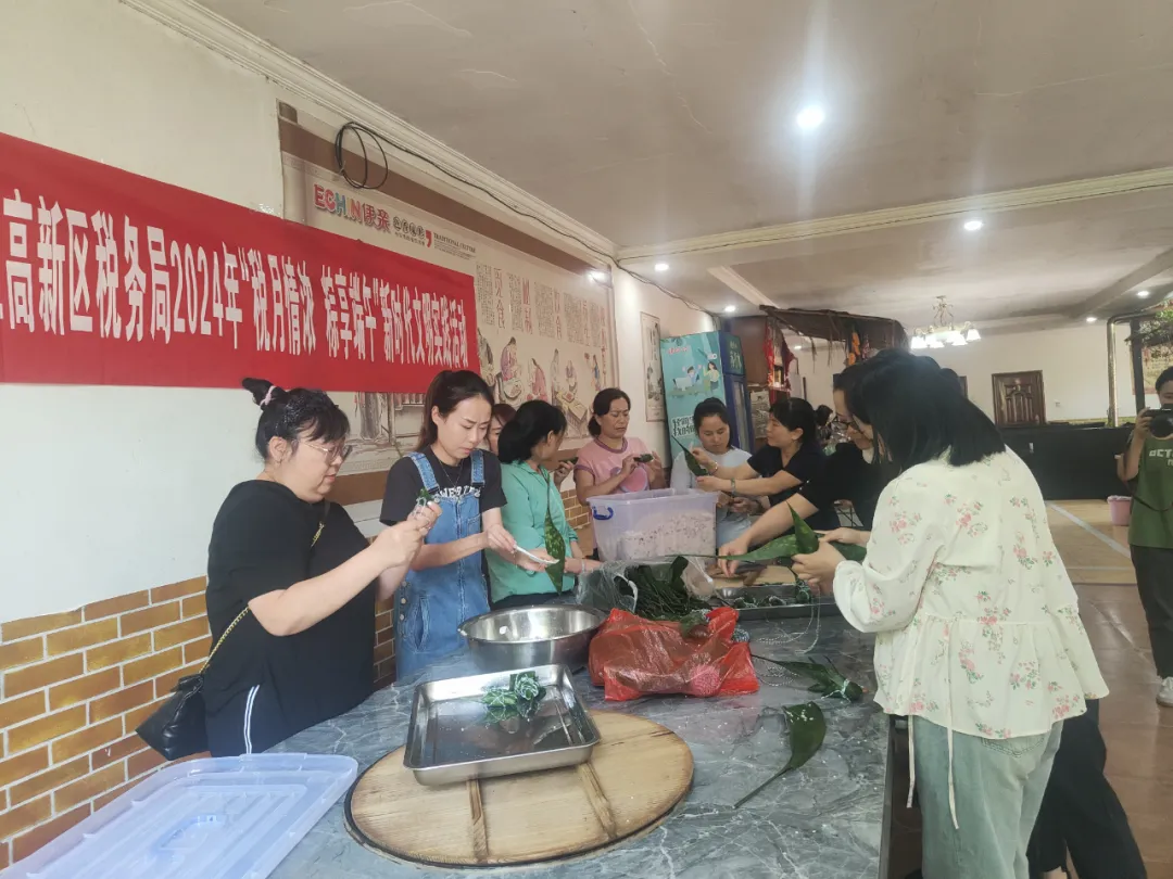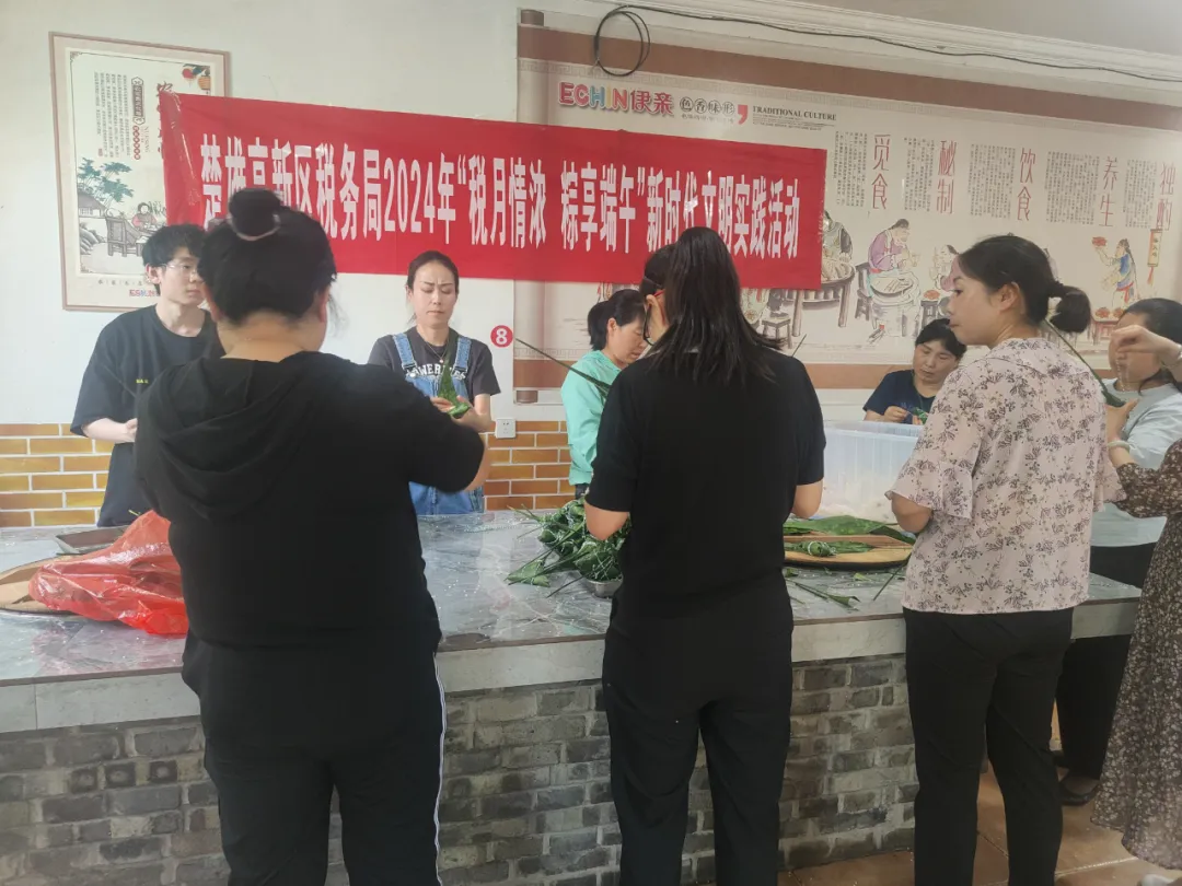 粽子香,香厨房。艾叶香,香满堂。为培育和践行社会主义核心价值观,营造健康文明,积极向上的文化氛围,让税务干部在体验中感受传统节日的魅力,2024年端午节来临之际,高新区税务局组织开展2024年“税月情浓‘粽’享端午“新时代文明实践活动,大家一起动手包粽子,手中忙碌着,脸上洋溢着笑容。