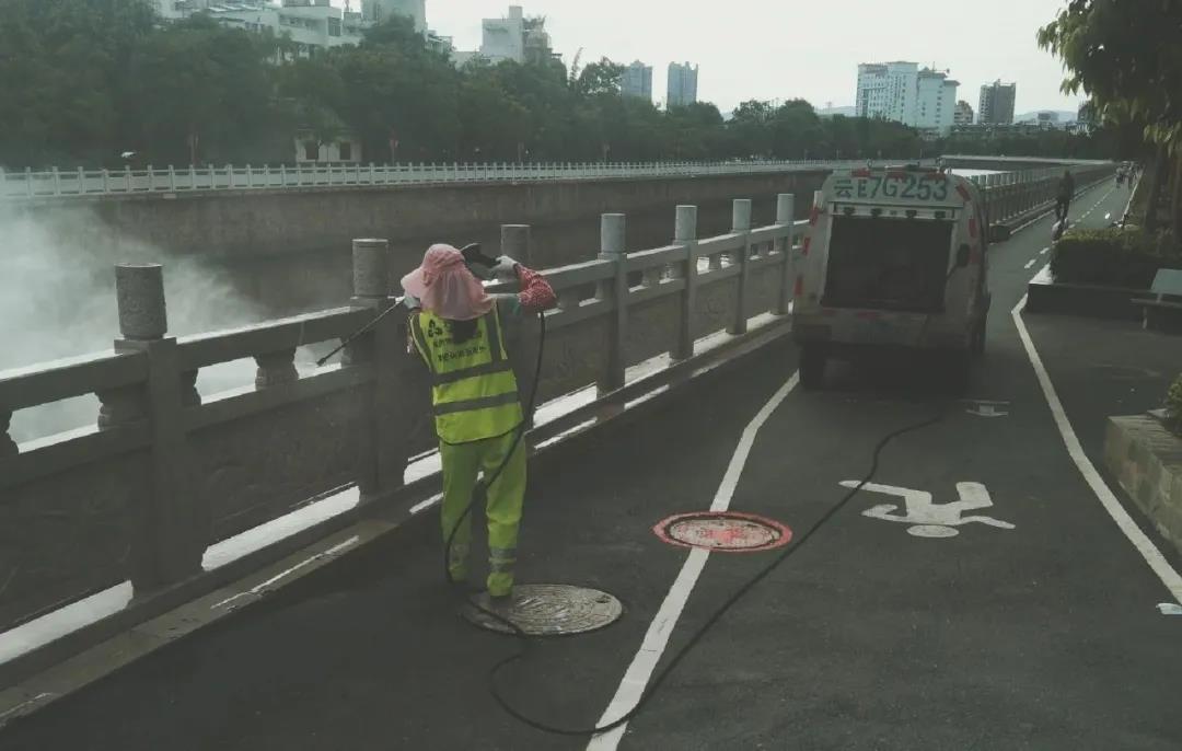 环卫工人定时清洗河岸步道、石栏、石凳、雕塑等配套设施,及时清除淤泥和脏迹,加大保洁力度,让美丽步道还原本色,把环境卫生改善好。