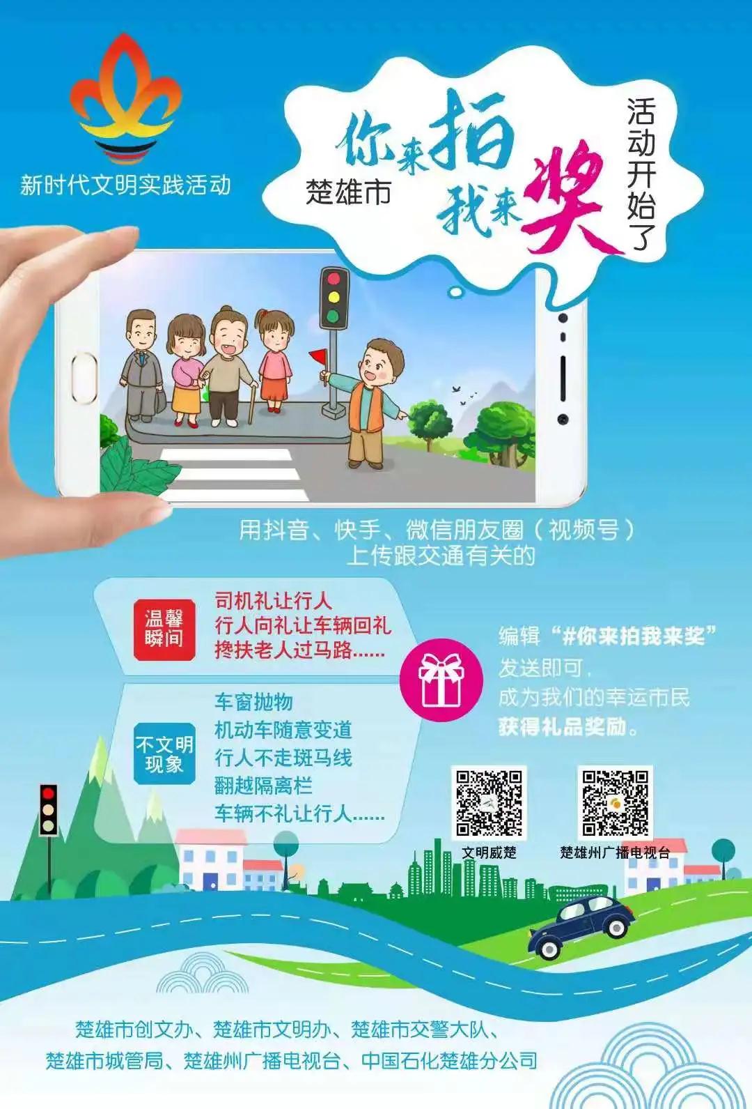 只要你看到并拍到发生在楚雄城市里的文明交通瞬间(例如:司机礼让行人、行人向礼让车辆回礼、搀扶老人过马路、主动扶起摔倒的骑车人等等)或者不文明交通陋习(例如:车窗抛物、机动车随意变道、行人不走斑马线、翻越隔离栏、车辆不礼让行人等等),把这些视频和照片用你的手机发抖音、快手或微信视频号就可参与!只是,记得文字标题一定包含“#你来拍我来奖”,再加上拍摄的时间地点就行!你发的视频和照片经过甄别后(其中不文明行为陋习由交警认定),由楚雄州广播电视台进行转发推送,并由中国石化楚雄分公司奖励50—100 元礼物。