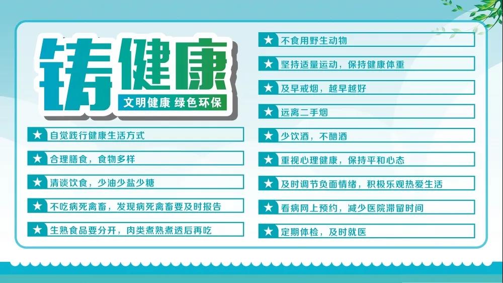 自觉践行健康生活方式,合理膳食,食物多样。清淡饮食,少油少盐少糖。不吃病死畜禽,发现病死畜禽及时报告。生熟食品要分开,肉类煮熟煮透后再吃。不食用野生动物。坚持适量运动,保持健康体重。戒烟限酒,远离陋习。生活规律,保持充足睡眠,保持心理平衡。