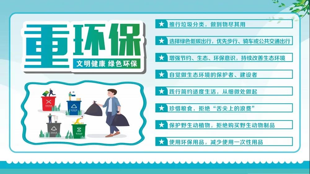 践行垃圾分类,做到物尽其用。选择绿色低碳出行,优先步行、骑车或公共交通出行。践行简约适度生活,从细微处做起。珍惜粮食,拒绝“舌尖上的浪费”。保护野生动物,拒绝购买野生动物制品。使用环保用品,减少使用一次性用品。