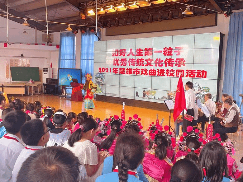 2021年以来,楚雄市在全力做实常用态化疫情防控工作同时,按照全市统一推进,分山区、坝区2个区域分别开展活动安排,由市文化和旅游局牵头,研究制定2021年楚雄市送戏曲进校园、进乡村活动方案,市乡政府筹措投入资金,切实把送“戏曲进校园”、“戏曲进乡村”作为巩固拓展脱贫攻坚成果同乡村振兴有效衔接的重要抓手,组织市演艺公司深入楚雄市的乡镇、北城小学、茶花谷小学等开展优秀传统文化戏曲进校园活动。一是深入推进戏曲进校园常态化。为了让孩子们感受戏曲的魅力,在学校多功能厅分别播放了非物质文化遗产“花灯”戏曲中的许多经典曲目。有《十大姐》、《桃花水》、《螃蟹调》、《巧梳妆》、《跳踮步》等选段,让同学们从细节感受到传统戏曲艺术的独特魅力,传承和发扬戏曲文化,加快创建特色校园文化,对传承文化,增强文化自信等起到积极作用,培养了学生对花灯戏曲艺术的兴趣,在学校范围形成了比较浓厚的戏曲艺术教育氛围。让戏曲文化学习逐渐常态化,促进戏曲文化推广与学校日常教学活动相结合,融入学生校园生活中。二是戏曲进乡村丰富了乡村未成年人文化生活。组织楚雄市演艺公司全体演职员到鹿城、八角等乡镇开展了“戏曲进乡村”活动。节目以非物质文化遗产“花灯”和“彝剧”为主,演出了花灯说唱节目《消防安全进万家》、彝剧小戏《半夜羊叫》。通过“花灯”、“彝剧”本土非遗项目的展演,让当地群众通俗易懂地了解了花灯戏曲艺术的基本唱腔及花灯相关的一些简单知识,在欣赏节目的同时,也了解了党和国家出台的一些方针政策和关心保护未成年人健康成长知识。