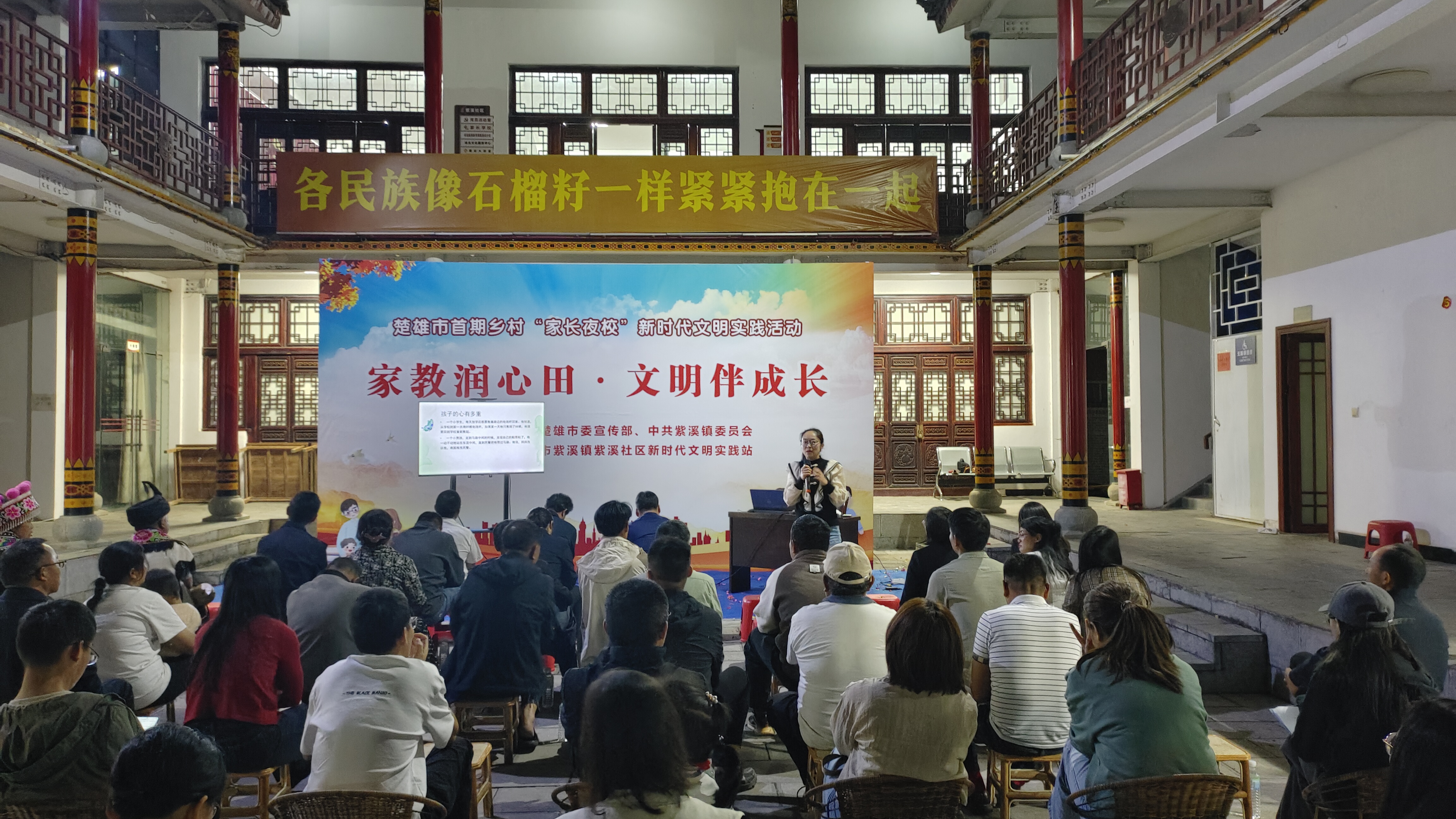 活动开始前,楚雄州委文明办专职副主任赵现培做了致辞讲话,强调:一是要以“小课堂”传递“大能量”。围绕“家风家教、未成年人教育、实用技能、文明风尚”等主题,精心打磨推出一批乡村“家长夜校”示范课程。二是要以“新阵地”培育“新风尚”。整合新时代文明实践阵地、农家书屋等资源,将夜校办成传播党的政策、弘扬优秀文化、促进邻里和谐的文明实践平台。三是要以“家校社”共绘“同心圆”。教育、妇联、团委、医院、高校等部门要加强联动,共同开展探索实践,全域打造乡村“家长夜校+”模式,把“家长夜校”办出质量、办出特色、办出水平。