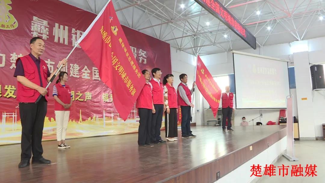 仪式上,州委宣传部副部长、州文明办主任黄玲和市委常委、市委组织部部长朱成玉分别为州、市银发志愿服务团授创文服务旗,市委副书记罗兴贵宣布助力行动启动。