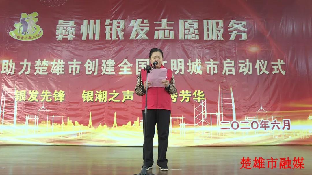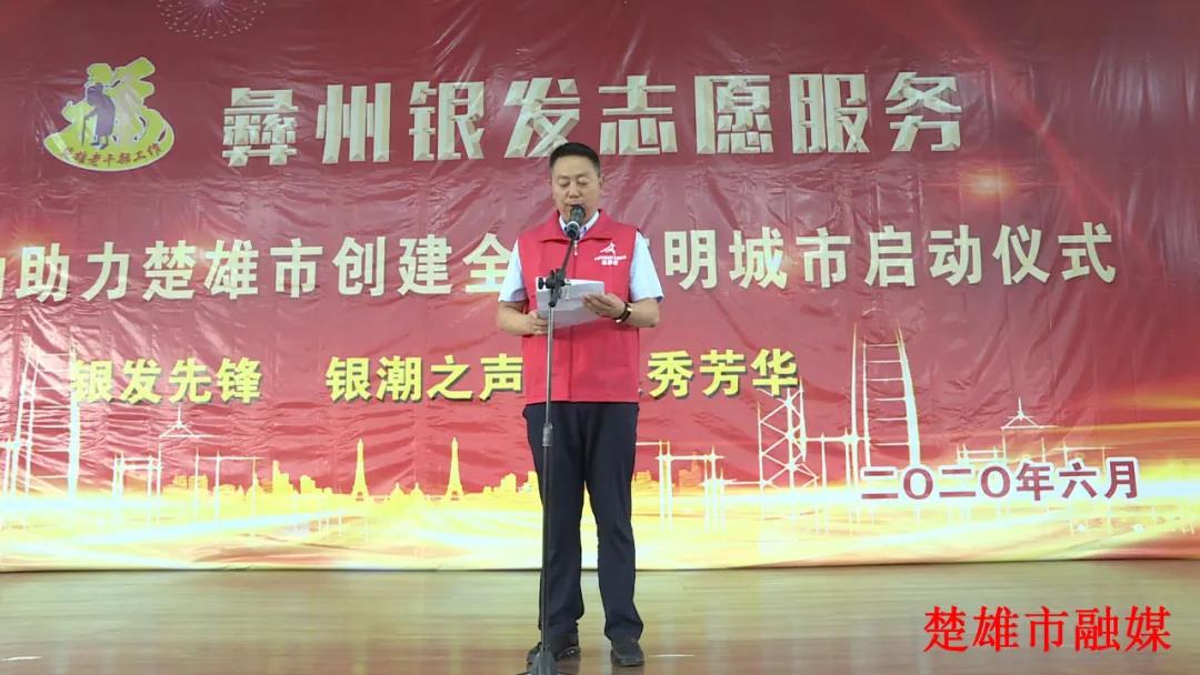 银发志愿者:作为老年人也是给我们一个发挥余热、增进社会和谐文明的好机会,作为退休同志,我自己加入这个组织以后会身体力行带动身边的人,带动家人,说文明话办文明事,推动我们楚雄市文明创建工作更加和谐,更加美好。