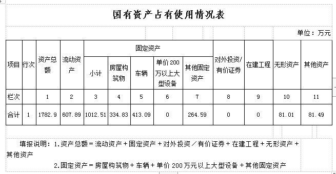 截至2019年12月31日,楚雄市城市管理综合行政执法局资产总额1782.9万元,其中,流动资产607.89万元,固定资产净值1012.51万元(其中房屋构筑物净值334.83万元,汽车净值413.09万元,其他固定资产净值264.59万元),对外投资及有价证券0万元,在建工程0万元,无形资产81.01万元,其他资产净值(司法局移交公共基础设施)81.49万元(具体内容详见附表)。与上年资产总额2232.74万元相比,本年资产总额减少449.84万元,其中固定资产减少777.24万元。处置房屋建筑物0平方米;处置车辆1辆,账面原值4.89万元;报废报损资产1项,账面原值0.45万元,实现资产处置收入0万元;出租房屋169平方米,账面原值9.48万元,实现资产使用收入0.59万元。