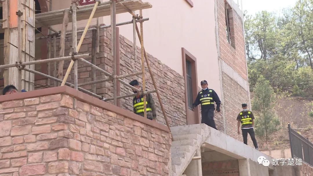 楚雄市城市管理综合行政执法局违建管理组组长褚曦熙:我们来到现场以后看到前面的阳台正在进行加盖,我们发出了责令整改通知书,当时他这里已经停工了,但后期我们接到举报,前面这里他没动了,他又在盖着后面的,今天我们就对他整体的违章建筑进行拆除。