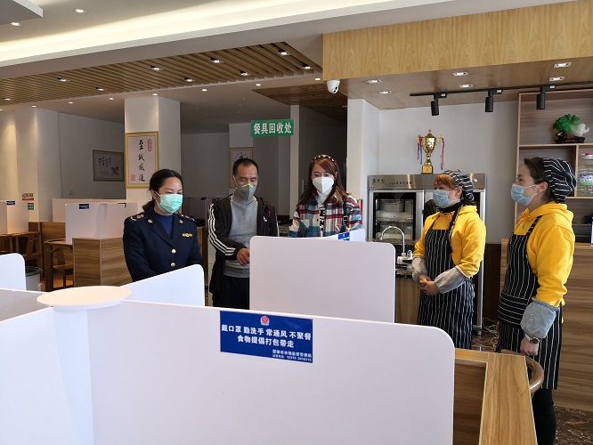 二是强化指导,完善防控体系,防控监管齐抓。在认真做好重点疫区外来经营人员排查登记、从业人员健康申报的前提下,坚持“复产一家、严管一家”的原则,要求餐饮经营户严格落实每日体温监测、切实做好员工健康管理、佩戴口罩作业,场所设施清洗消毒、保持餐厅通风整洁、认真执行扫码登记、严禁店内聚餐、推广上门自取或外卖送餐;督促餐饮经营户自觉履行食品安全主体责任,严格食品生产经营操作安全规范、食品原料进货查验等制度。严禁采购加工、使用野生动物和不明来源的活禽,加强畜禽肉及制品检疫凭证审查,抓牢抓实疫情防控和食品安全工作。