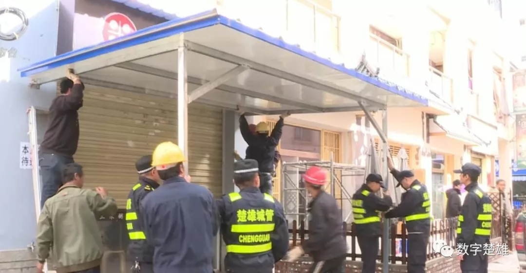 楚雄市城市管理综合行政执法局执法队员 靳文华:这些未经规划主管部门许可,擅自搭建件构筑物,第一是影响城市的形象,第二是影响消防通道的畅通,对广大商家出入带来不便,所以这次我们依法发了责令整改通知书以后,现在进行强制拆除。
