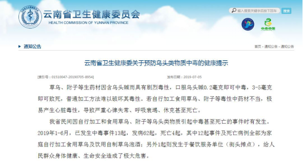 据通报信息显示,云南省民间因自行加工和食用草乌、附子等乌头类物质引起中毒甚至死亡的事件时有发生。