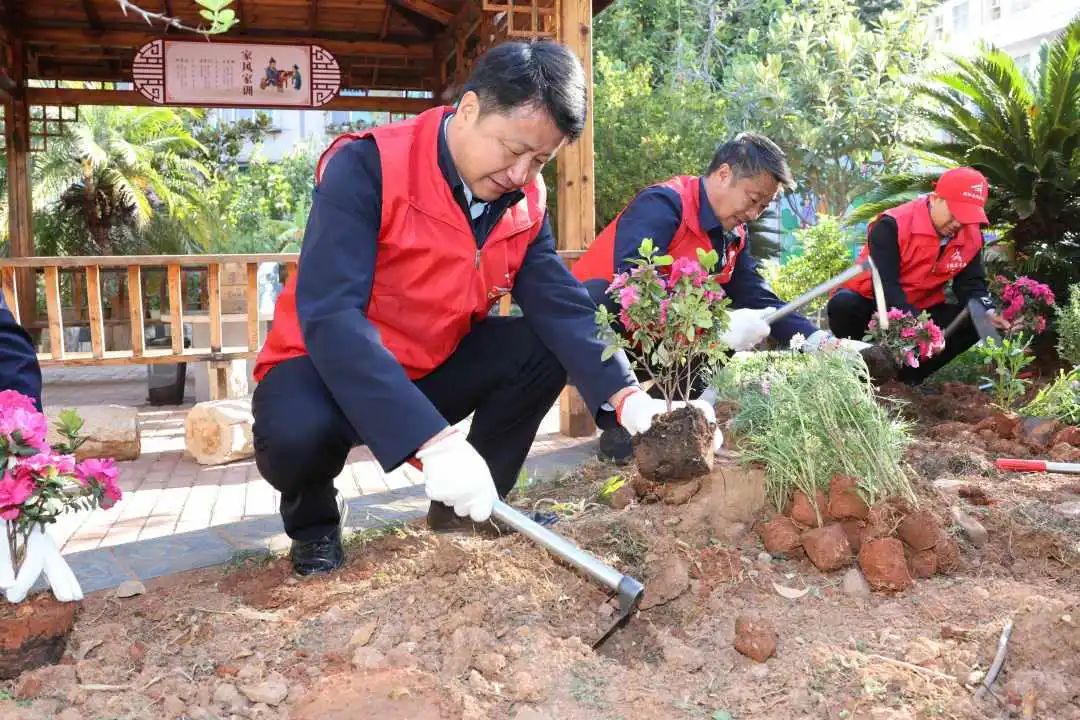 在刘勇同志带领下,志愿者们还来到学桥街社区州供销社住宿小区开展新时代文明实践志愿服务活动。大家手拿工具、分工协作,为小区绿化带除草起垄、挖坑栽花、培土浇水等,经过一番劳作,一株株花苗挺立在春风中,焕发出蓬勃生机。党员志愿者们积极发挥先锋模范作用,以实际行动有效改善了社区居民的生活环境。