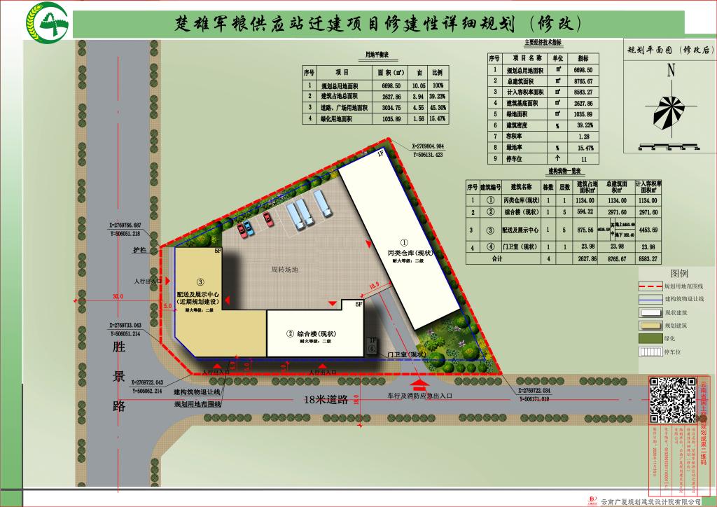 项目简介:楚雄军粮供应站迁建项目位于楚雄市花果山片区北侧,地块东临云南楚雄国家粮食储备库,南临云荫寺路,西临胜景路,北临现状空地,规划用地面积10.05亩。该项目修建性详细规划于2010年6月审定实施,现楚雄军粮供应站提出在各项经济技术指标满足相关要求的前提下对该项目修建性详细规划设计方案进行修改。