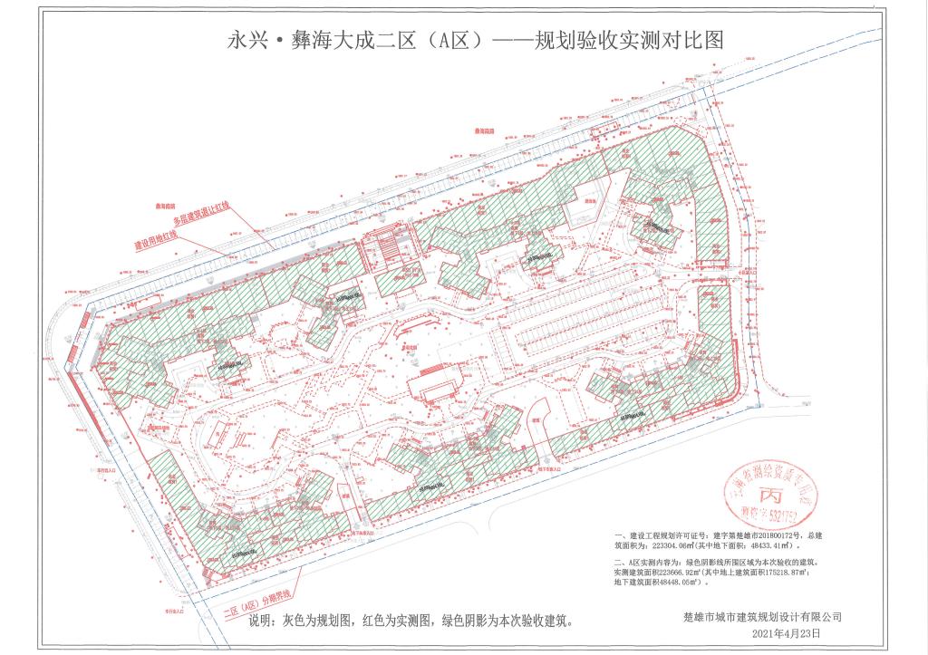 项目简介:楚雄永兴彝海房地产开发有限责任公司报审的永兴彝海大成二区(A区)修建性详细规划修改方案于2018年9月审定实施,项目用地位于楚雄市鹿城镇彝海公园南侧。永兴彝海大成二区(A区)规划用地面积45964.64平方米,规划建筑面积223304.06平方米,其中计容建筑面积171476.53平方米(含公共配套建筑面积1471.41平方米),不计容建筑面积51827.53平方米,建筑密度28.6%,容积率3.73,绿地率31.65%,机动车停车位共1492个,非机动车停车位990个。2018年9月该公司对该项目进行报建,并按程序办理了编号为建字第楚雄市201800172号的《建设工程规划许可证》,建设规模为223304.06平方米(其中地上174870.65平方米,地下48433.41平方米),其许可内容为:高层底商住宅1栋框剪结构地上31层裙楼1层(其1层裙楼为商业,同时1层设有健身活动用房和架空层)、高层底商住宅1栋框剪结构地上31层裙楼1层(其1层裙楼为商业,同时1层设有架空层和一栋1层架空门厅)、高层底商住宅1栋框剪结构地上31层裙楼1层(其1层裙楼为商业,同时1层设有公厕、社区用房和架空层)、高层底商住宅1栋框剪结构地上31层裙楼1层局部2层(其1层、2层裙楼为商业,同时1层设有架空层,1、2层设有物管用房)、高层底商住宅2栋框剪结构地上28层局部31层裙楼1层(其1层裙楼为商业,同时1层设有公厕和架空层)、高层底商住宅1栋框剪结构地上31层裙楼1层(其1层裙楼为商业,同时1层设有消防控制室和架空层)、地下室一栋框架结构一层局部二层(地下一层局部设夹层主要用途为非机动车停车库)。2021年4月楚雄永兴彝海房地产开发有限责任公司向我局申请对已竣工的永兴彝海大成二区(A区)建设内容进行规划核实验收,经测绘单位实测和现场比对,永兴彝海大成二区(A区)A区项目实测用地面积45964.64平方米,总建筑面积为223666.92平方米(其中地上175218.87平方米,地下48448.05平方米),计容建筑面积171561.56平方米(含配套用房面积1520.99平方米),不计容建筑面积52105.36平方米,建筑密度29.91%,容积率3.73,绿地率30.23%,机动车停车位共1492个,非机动车停车位990个,A区项目总建筑面积超出规划许可建筑面积362.86平方米(A-6#及A-8#增设非机动车车库出屋面通道永久性结构顶板,A-1#及A-3#增设建筑排烟井,上述行为未按照规划许可内容实施建设)。根据《楚雄州建设工程竣工规划验收管理办法》的规定特进行公示,如对永兴彝海大成二区(A区)建设内容规划核实验收有异议的请在公示期限内与我局联系。